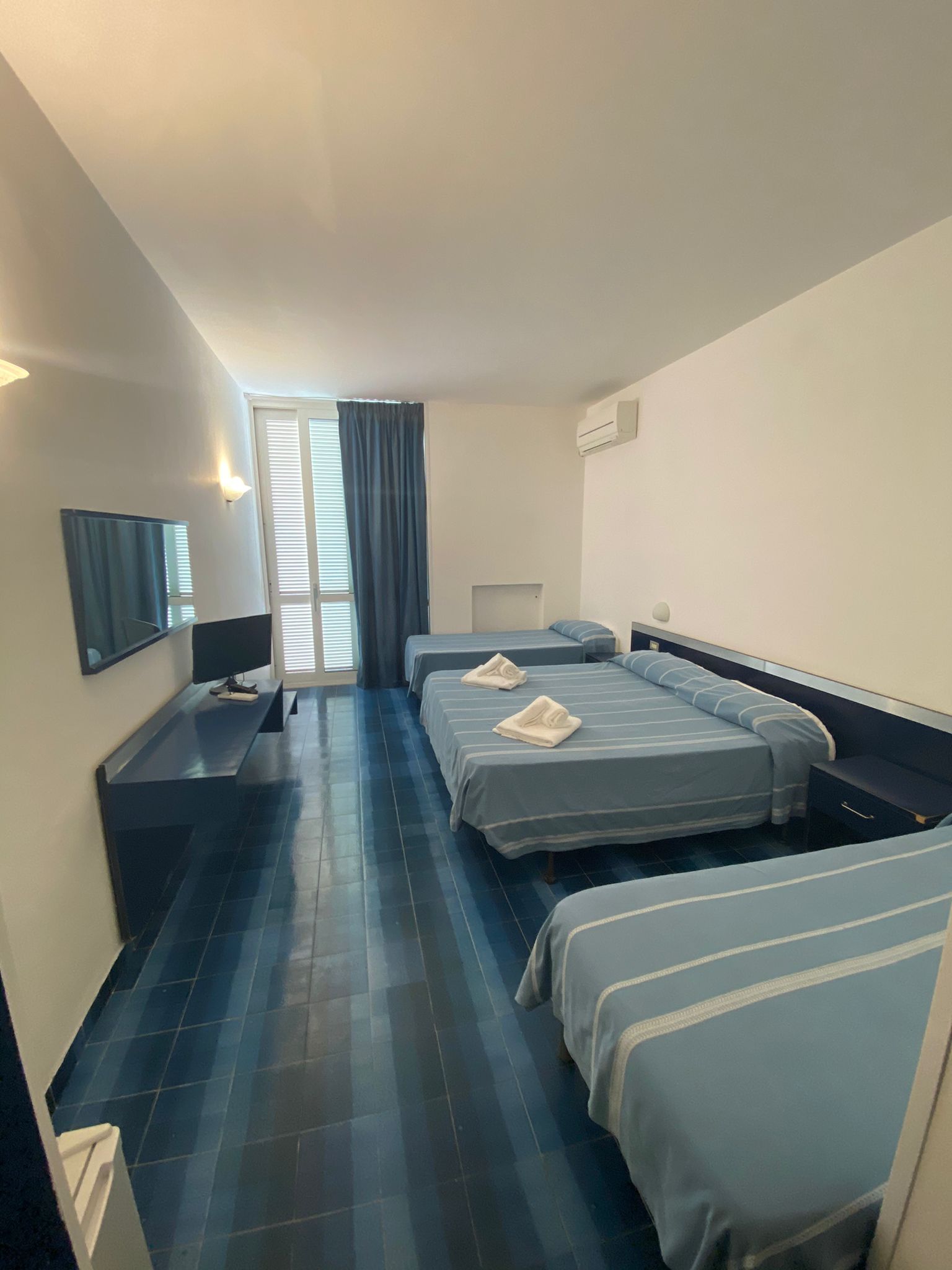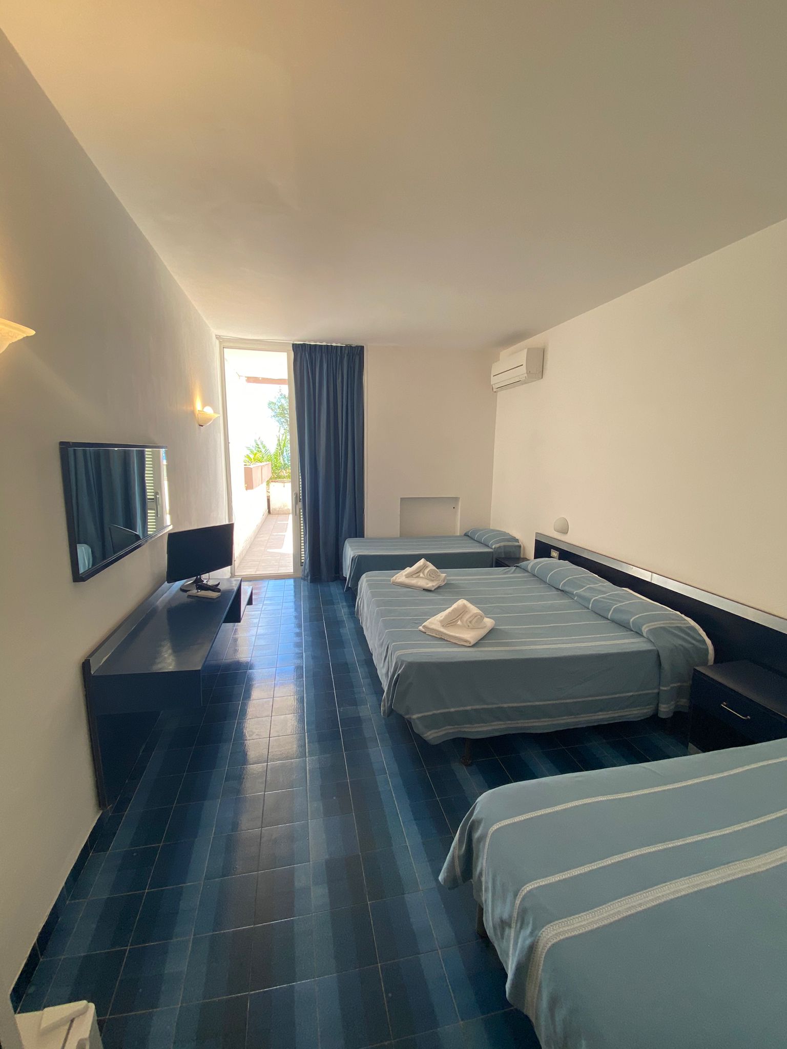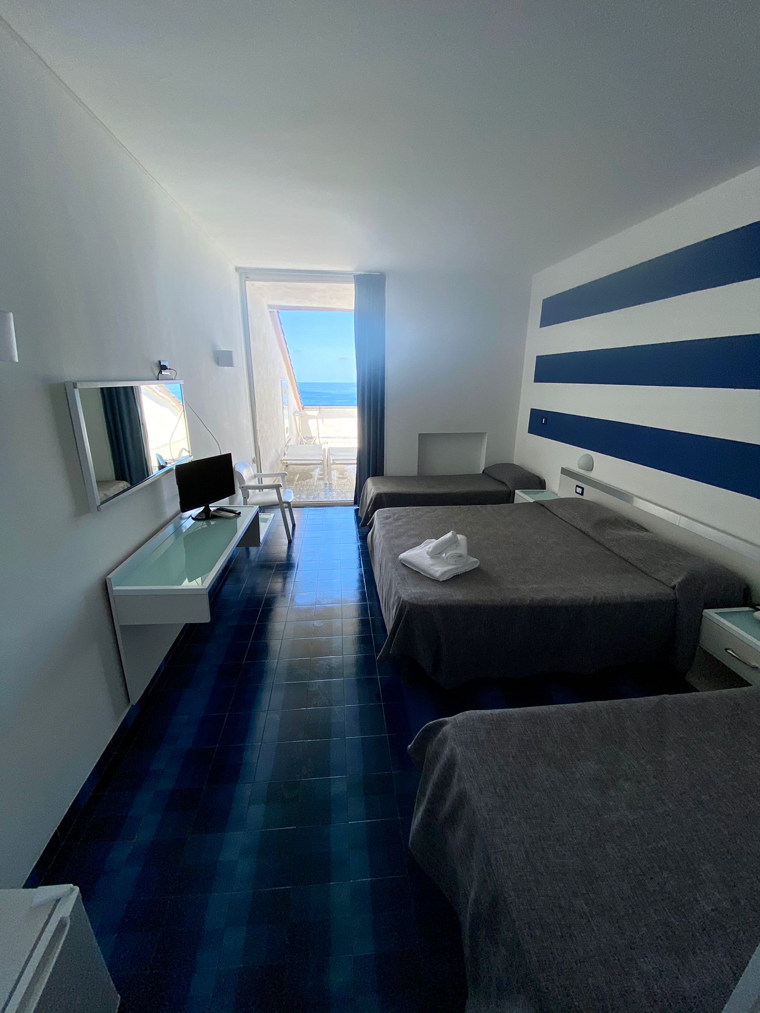 Room with private terrace and sea view. Large and bright, with a double bed and two single beds. Perfect for families.